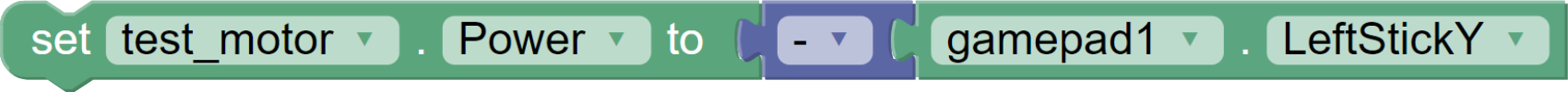 Drag the negative symbol block so it snaps in place between the <img src="https://1359443677-files.gitbook.io/~/files/v0/b/gitbook-legacy-files/o/assets%2F-M4_pJHI8HTuZFQTNfcy%2F-MWACJyDlnpPjKwQvDeW%2F-MWBG9sHCXphC82ifCqS%2FMotor%20-%20%20testmotor%20set%20power.svg?alt=media&#x26;token=41a570cb-db24-4cc9-a41f-7bbd92ce8ff2" alt="" data-size="original"> and <img src="https://1359443677-files.gitbook.io/~/files/v0/b/gitbook-legacy-files/o/assets%2F-M4_pJHI8HTuZFQTNfcy%2F-MWACJyDlnpPjKwQvDeW%2F-MWBHSepopUHbk0AbzGq%2Fgamepad%20-%20leftsticky.svg?alt=media&#x26;token=214b31c1-622c-4913-884c-a6b9d2e6ebb9" alt="" data-size="original"> blocks: