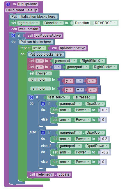 {% file src="<https://1359443677-files.gitbook.io/~/files/v0/b/gitbook-x-prod.appspot.com/o/spaces%2FUOOiQ4S2QcMWmVoSmeQ8%2Fuploads%2FKM5cEnjEr1QgbDgLI6mj%2FHelloRobot_TeleOp.blk?alt=media&token=c0205c73-705a-4477-be89-c54175181d4a>" %}