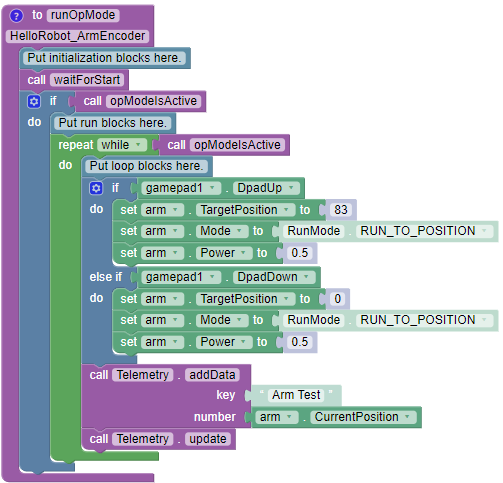 When `DpadUp` is pressed, the arm should move to the the 90 degree position. When `DpadDown` is pressed the arm should move back to the starting position. To do this, set the first <img src="https://1359443677-files.gitbook.io/~/files/v0/b/gitbook-legacy-files/o/assets%2F-M4_pJHI8HTuZFQTNfcy%2F-MadRPzxQDwEcPdg_MX-%2F-Mai71kIttY8M1PhNW8b%2Farm%20-%20set%20arm%20to%20targetPosition.svg?alt=media&#x26;token=a2dfe87f-acc6-44fd-ab81-4d003ba2dbdd" alt="" data-size="original"> equal to the number of ticks it took your arm to get to 90 degrees, for this example we will use 83 ticks.&#x20;