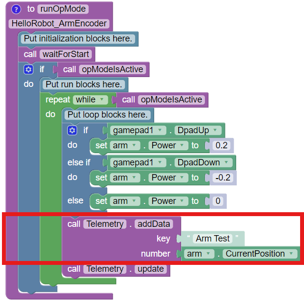 Within the loop we'll add a <img src="https://1359443677-files.gitbook.io/~/files/v0/b/gitbook-legacy-files/o/assets%2F-M4_pJHI8HTuZFQTNfcy%2F-MWACJyDlnpPjKwQvDeW%2F-MWBJfpbTuatRMfbhnlO%2FTelemetry%20-%20key%20and%20number.svg?alt=media&#x26;token=d6f21b70-8197-4ead-954a-2604cfb72155" alt="" data-size="original"> block. Add the <img src="https://1359443677-files.gitbook.io/~/files/v0/b/gitbook-legacy-files/o/assets%2F-M4_pJHI8HTuZFQTNfcy%2F-MaUgx24O_aiERCHX2_C%2F-MaZ6jj3OgarZ9wIkHBe%2Fmotor%20-%20arm%20get%20current%20positon.svg?alt=media&#x26;token=aa7cf01d-1009-44bf-be0f-9eb829475334" alt="" data-size="original"> to the number portion of the <img src="https://1359443677-files.gitbook.io/~/files/v0/b/gitbook-legacy-files/o/assets%2F-M4_pJHI8HTuZFQTNfcy%2F-MWACJyDlnpPjKwQvDeW%2F-MWBJfpbTuatRMfbhnlO%2FTelemetry%20-%20key%20and%20number.svg?alt=media&#x26;token=d6f21b70-8197-4ead-954a-2604cfb72155" alt="" data-size="original"> block. Change the key string from the default `"key"` to `"Arm Test."`