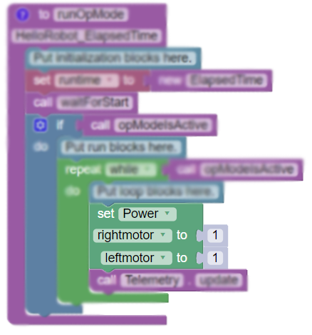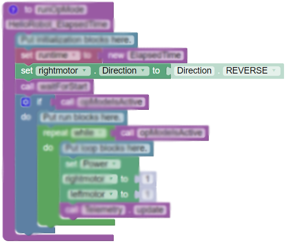 Before moving on to the rest of the ElapsedTime structure lets go ahead and add the motor related blocks. Add to the op mode to the while loop.