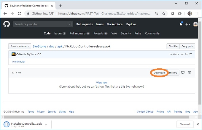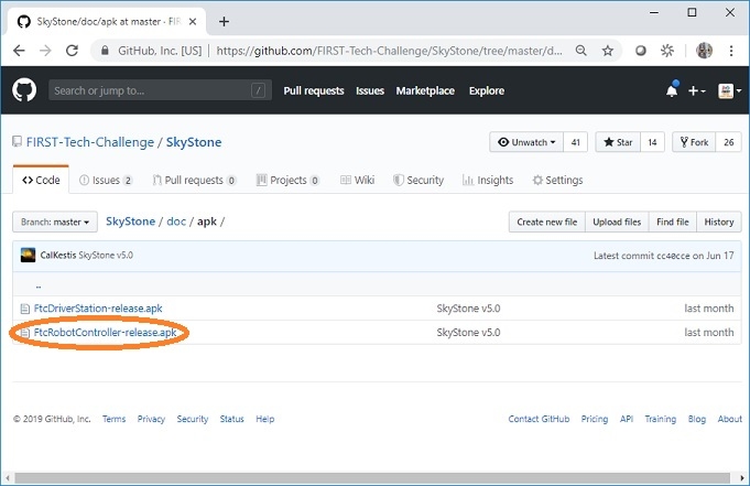 Click on the FtcRobotController-release.apk link in the repository to access the Robot Controller file.