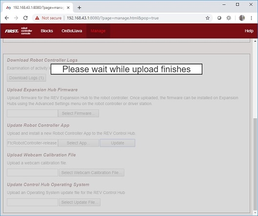 On the Manage page, click on the Select App button to select the Robot Controller app that you would like to upload to the Control Hub.