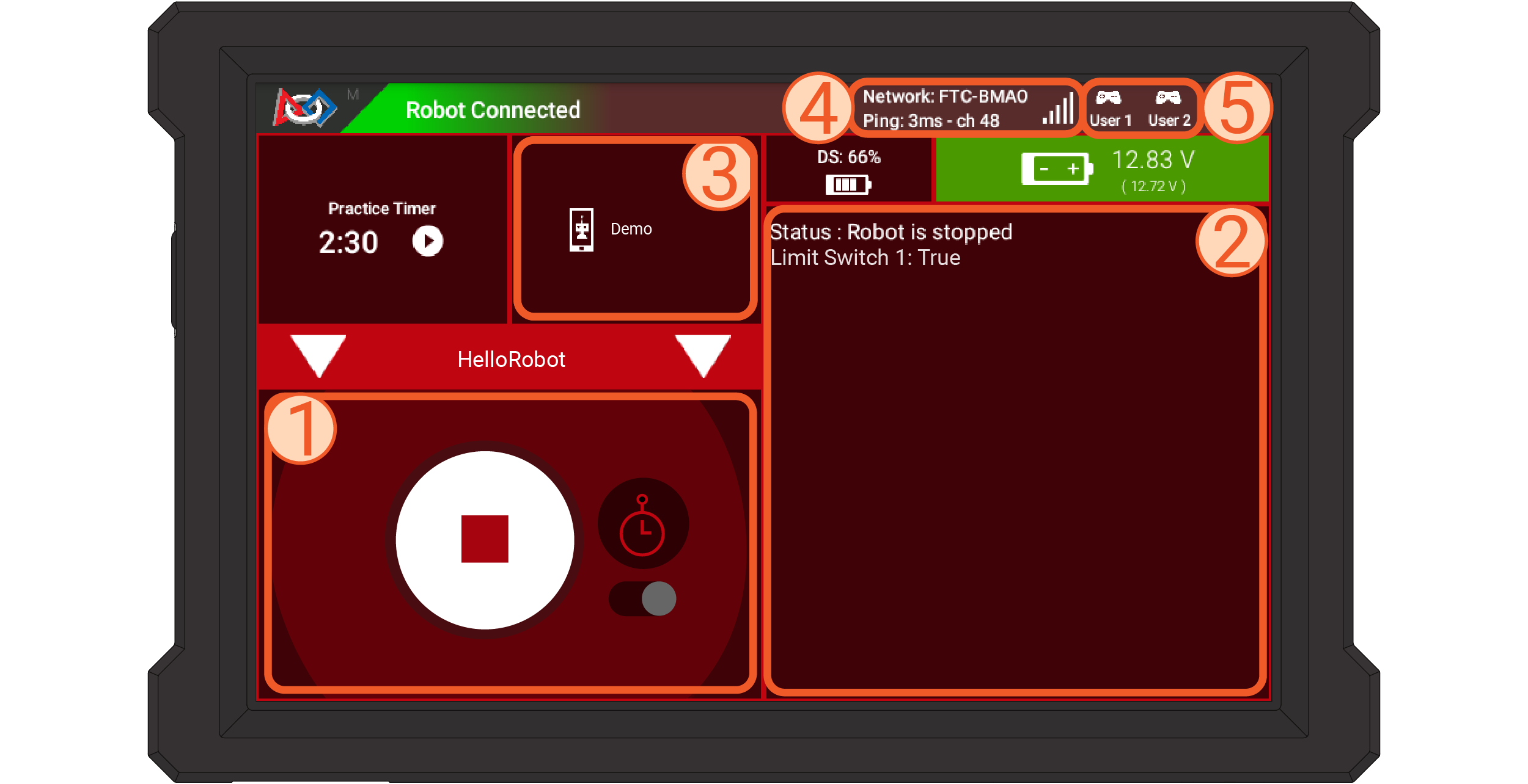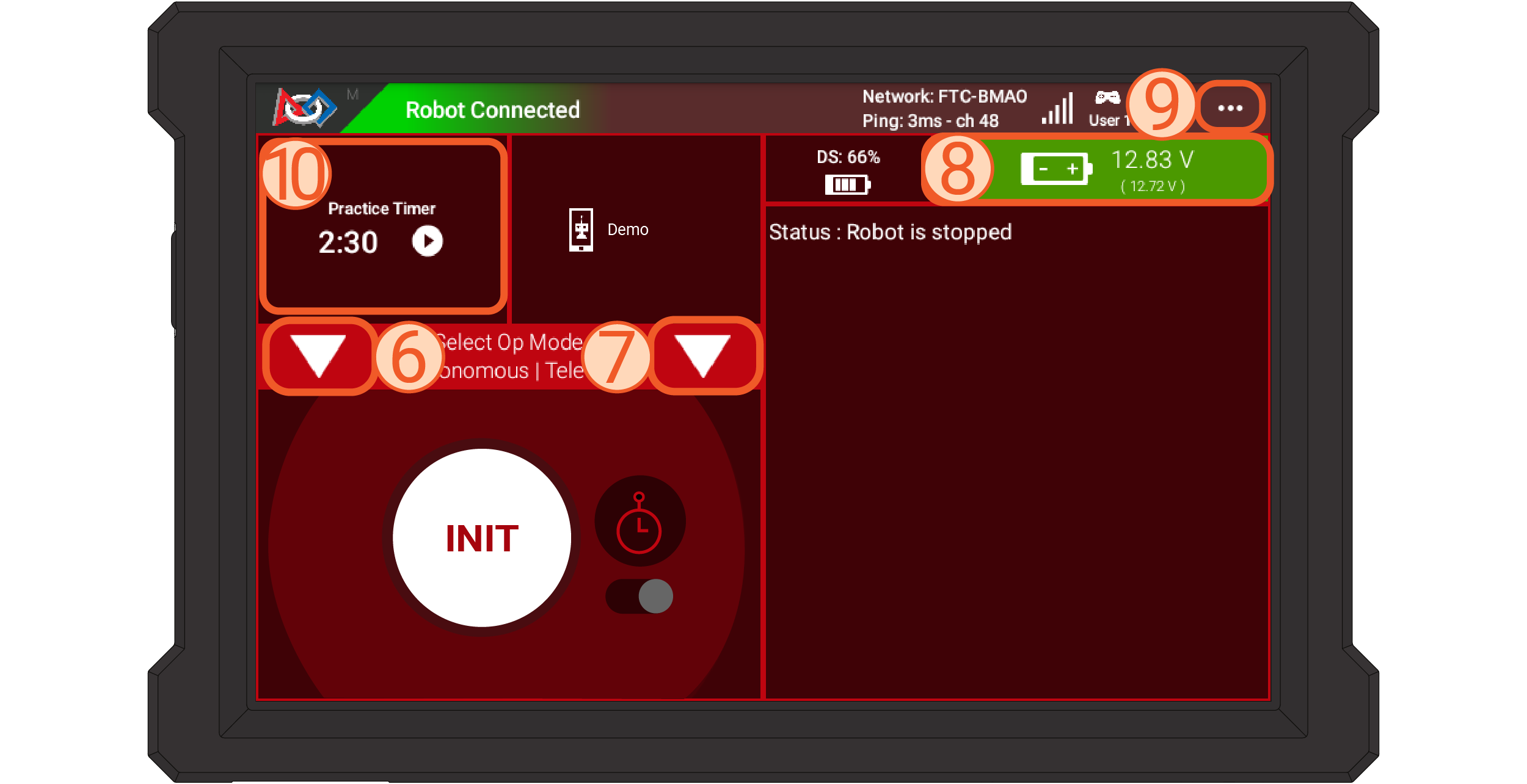 | 8  | System power display                 | Displays the amount of battery voltage powering the robot, when connected to a Control Hub.                                                                                                                                                      |