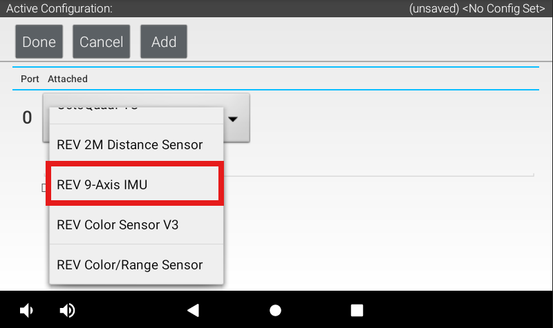 Scroll to select the REV 9-Axis IMU from the dropdown menu.