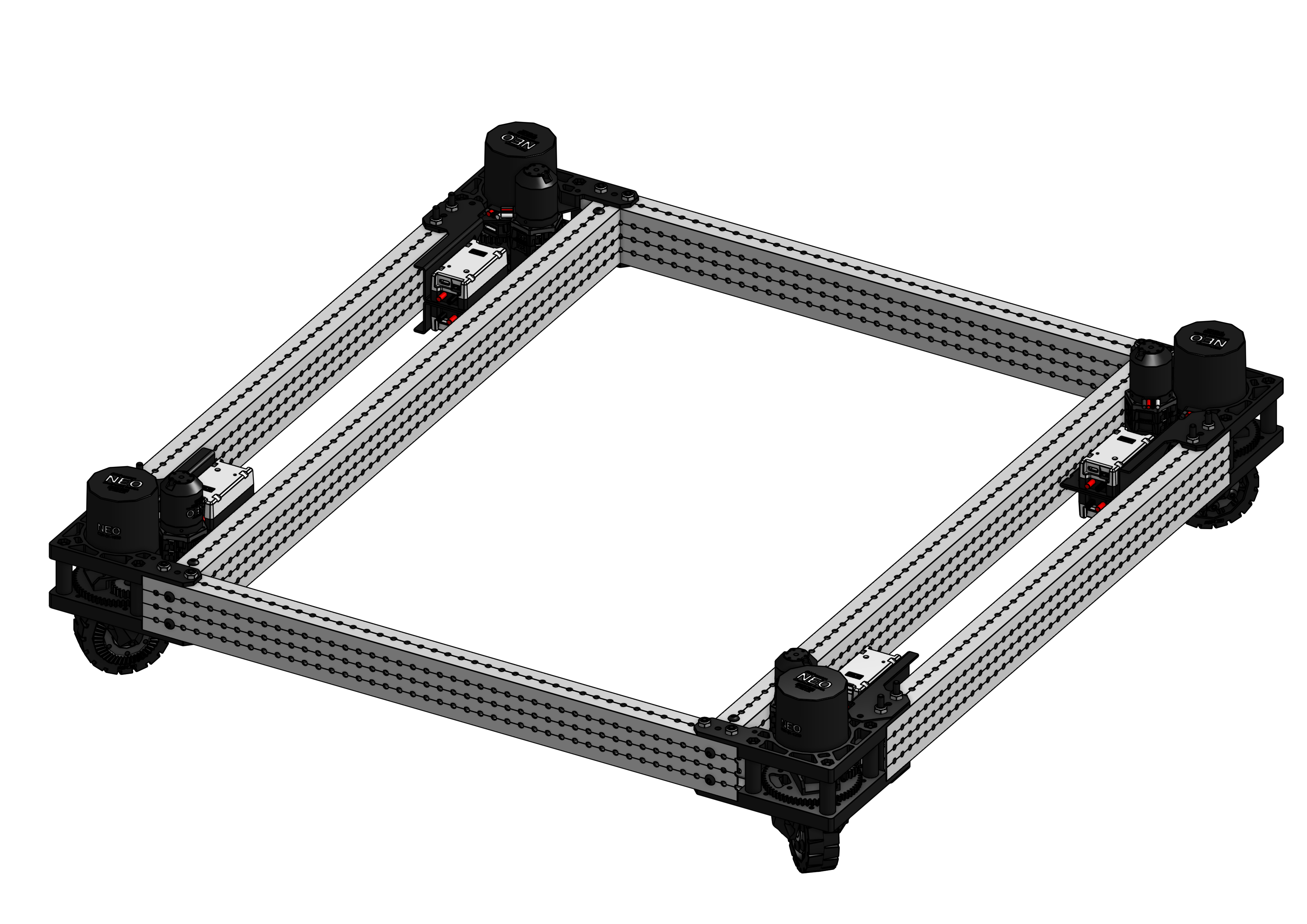 Most drivetrains will use motors connected to gearboxes to transmit motion to wheels with belts or chain. Some teams will incorporate parts such as pneumatics and servos into their drivetrains as well, allowing for shifting of gears and changing what wheels are in contact with the ground at certain points in the game.