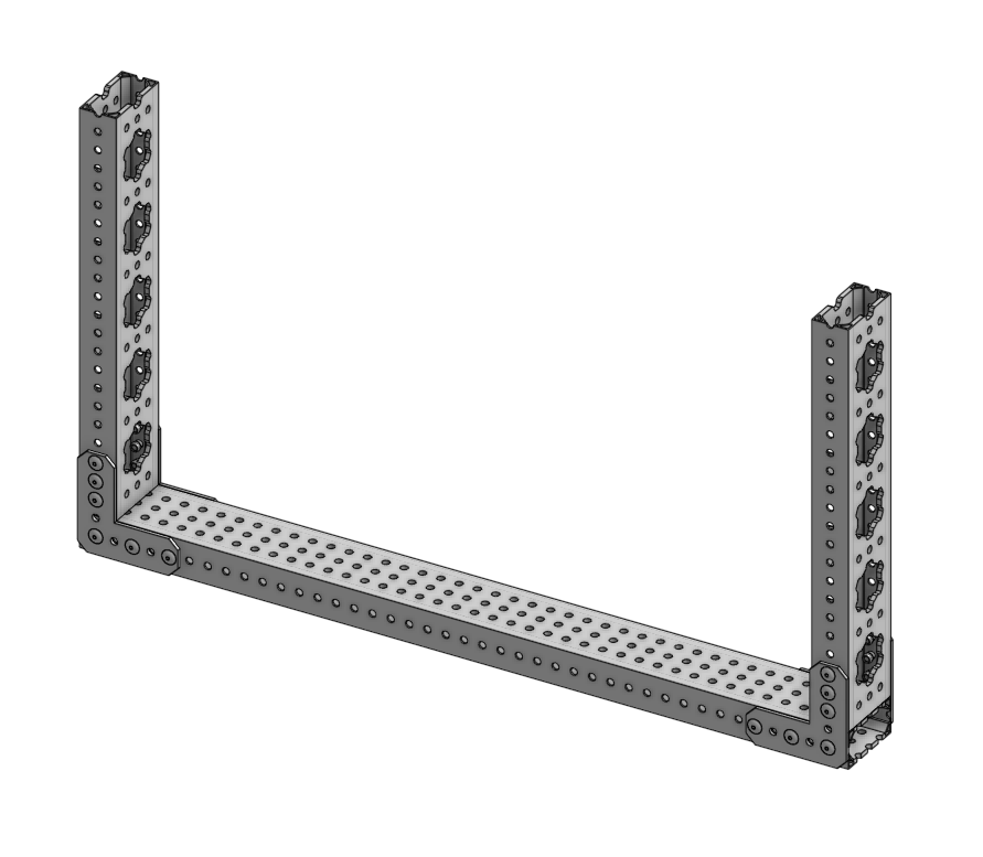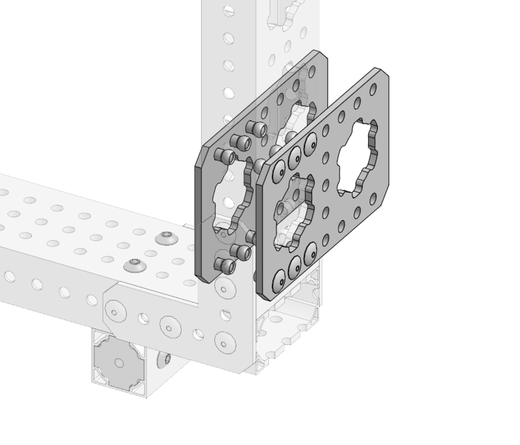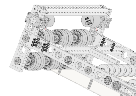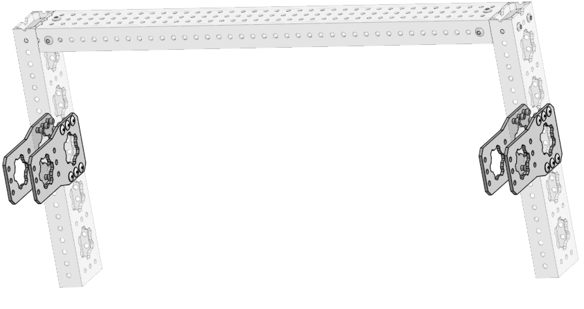 Use 2-1/2in Screws and nuts to secure the Four-Bar assembly to the Drivetrain. You will be using the 16th and 20th holes from the edge of drivetrain. Please Note: This is assembly with our MAXSwerve Drivetrain.