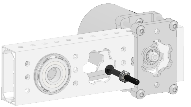 Insert the the 1/2in Hex Shaft as shown, with the 52T gear and shaft collars on the inside and the 16T gears and end screws on the outside.