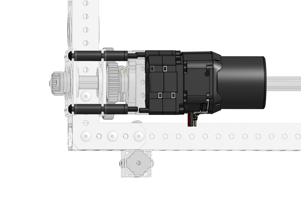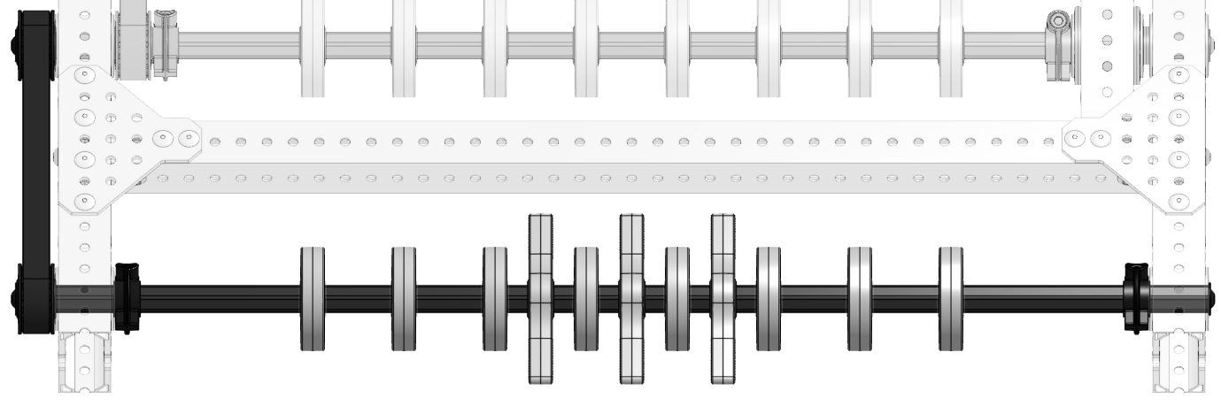 Insert the 22.125in Hex Shaft through the upper bearing on the left side frame and the 22.875in through the middle bearing on the same side. Slide onto these shafts the RT25 Pulleys and Belt at the same time for tension. Secure the pulleys with Shaft Collars and then slide on 8 Grip wheels on each shaft. Center the upper shaft an secure it with a shaft collar on the right, then both ends with Shaft End Screws. Slide onto the Middle shaft, a shaft collar and the free floating gearbox assembled in previous steps. Slide the shaft to leave the excess on left side of the frame as shown. Screw a Shaft End Screw into the right side of the shaft. Please Note: Adjust MAXSpline Bearing Block on the free floating gearbox to create tension on the the belt. You may also choose to secure the gearbox to the frame of the intake with the fastener of your choice. i.e. zip ties. Please Note: A little bit of tape in-between each grip wheel will keep them from sliding on the shaft.