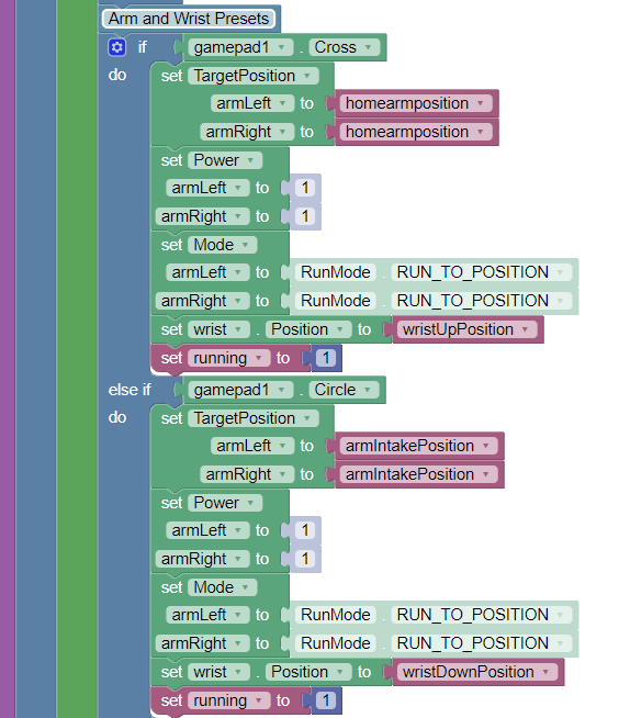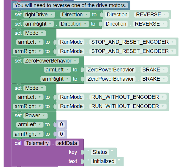 This section acts as an additional check for resetting the arm's power and position as well as setting the Core Hex Motors to "RUN_TO_POSITION" mode as default when the play button is clicked.