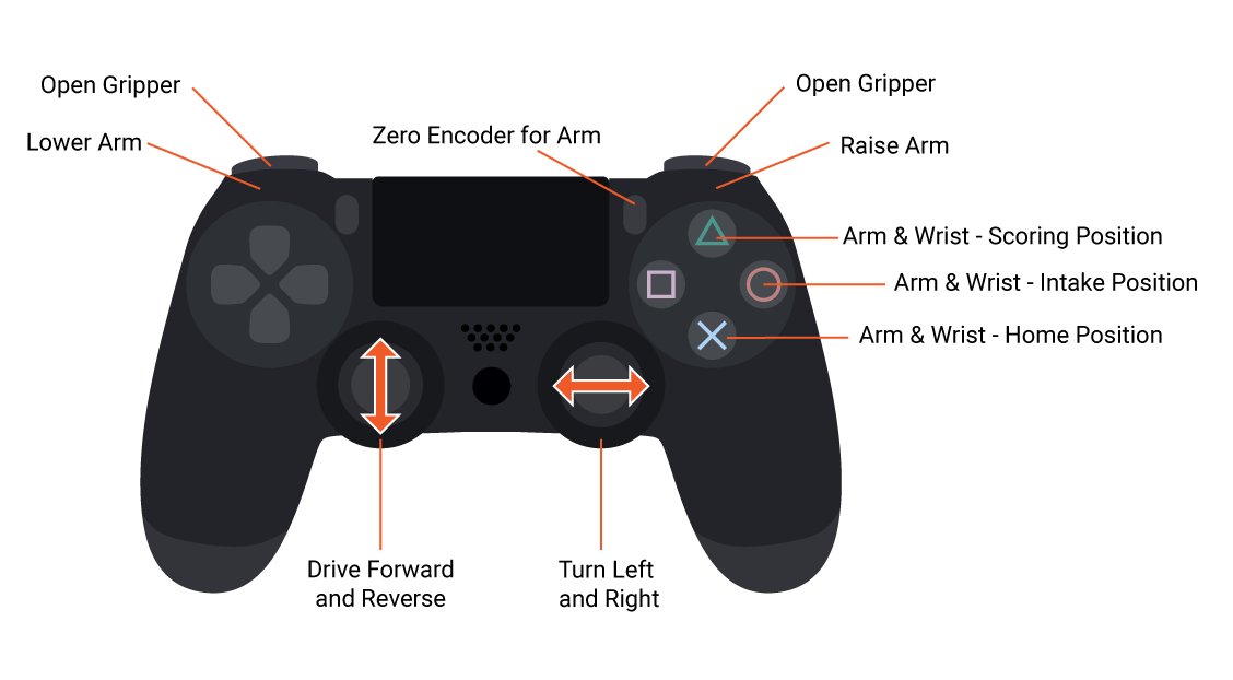 There are multiple buttons in play for this year's Starter Bot. Both bumpers control the gripper's ability to pick up Pixels. The wrist servo is bound to the "A/Cross" and "B/Circle" buttons for rotating between the intake and home position. Lastly, this year's arm is controlled by the triggers.