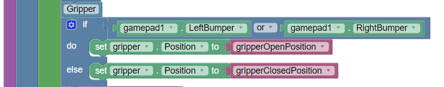 When either or both of the bumpers on the controller are held down the gripper will open fully. When released it will return to the closed position to secure the fingers around the pixel.