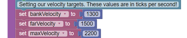 The three variables used in our program this year are used to set targets for what velocity our flywheel needs to reach. If at any time the target velocity needs to be adjusted it only has to be updated here to reflect through the whole code!&#x20;