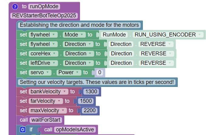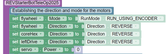 Before the bulk of our program begins, we need to first establish our variables and tell our motors how we want them to run. This section of code will run once when the program is activated and before we hit "Play" on the Driver Hub.
