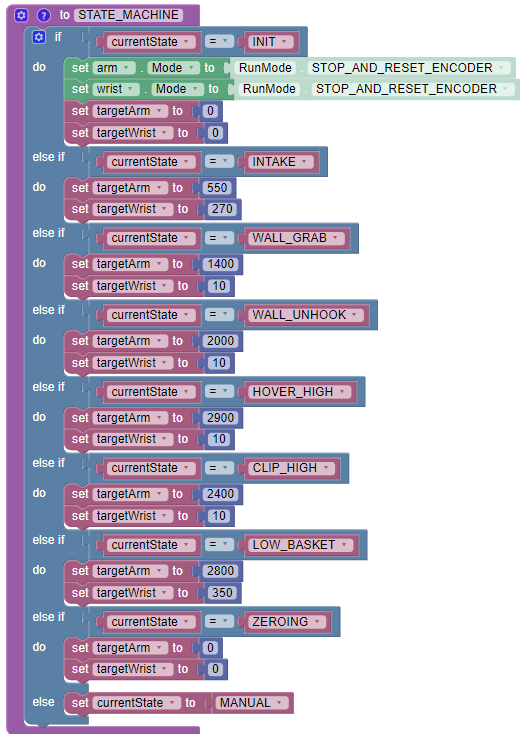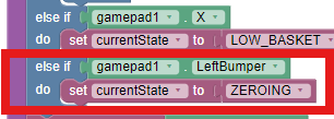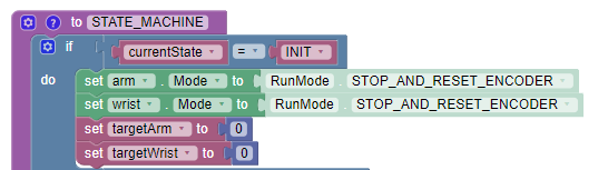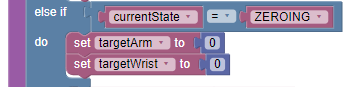 When pressing the left bumper on the gamepad, the arm and wrist will return to their start up position. To prevent this from also resetting the encoder, a new variable called ZEROING has been added to our STATE\_MACHINE as seen below: