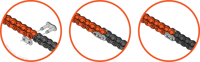Roller chain is typically connected into a continuous loop. This can be done using a Chain Tool to press the pins in and out of the desired outer link as described in the build guide. An alternate way to make the chain is using a common roller chain accessory called a [Master Link](https://app.gitbook.com/s/H9K1InCLC1ZxIkdPJt31/motion/sprockets-and-chain/chain-tool#master-links), or quick-release link. Two of these master links come in your FTC Starter Kit V3.1. Master links allow for easy chain assembly/disassembly without any special chain tools. Master links can typically be reused many times, but can become bent with multiple uses. At the point that master links become bent they should be discarded.