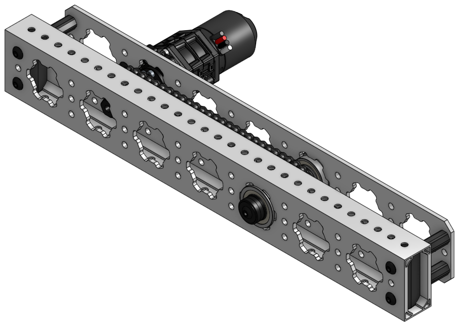 Demonstrates mounting the 2 Motor Gearbox parallel to MAX Pattern MAXTube to drive an internal sprocket and chain