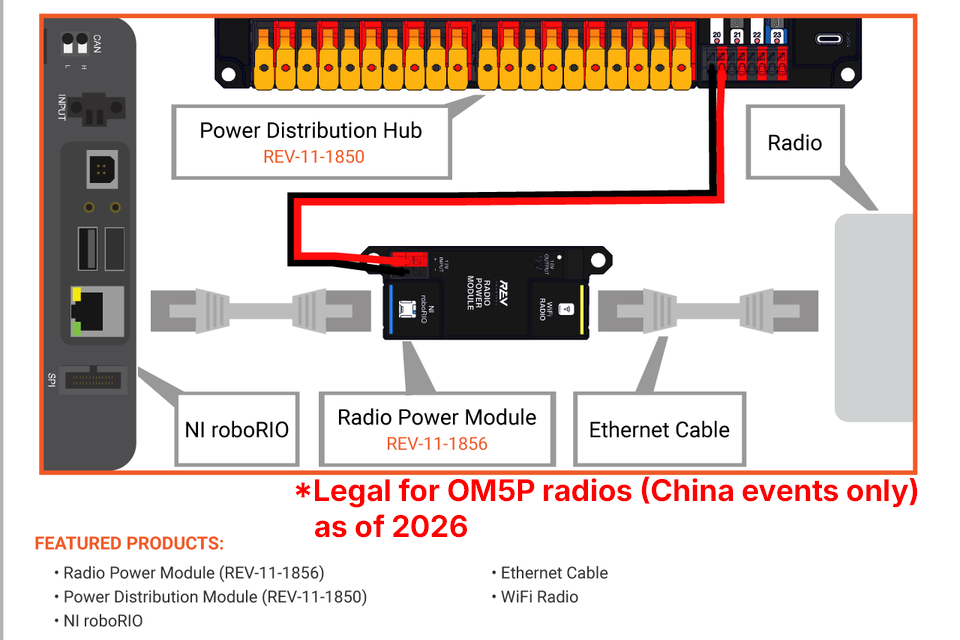 As of the 2026 *FIRST* Robotics Competition Season, the Radio Power Module (REV-11-1856) is only legal with the OM5P radios.&#x20;
