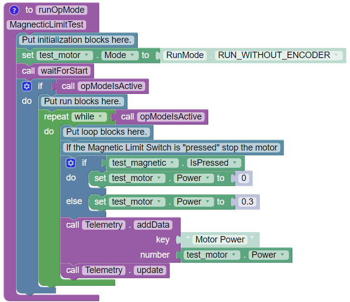 The code blocks below gives a basic example of how to use the Magnetic Limit Switch to limit the motion range of a motor using if/else logic. If the magnet is within range of the sensor, then the motor stops. Otherwise, the motor is allowed to move. When triggered by proximity to a magnet, the sensor is considered **pressed**.&#x20;