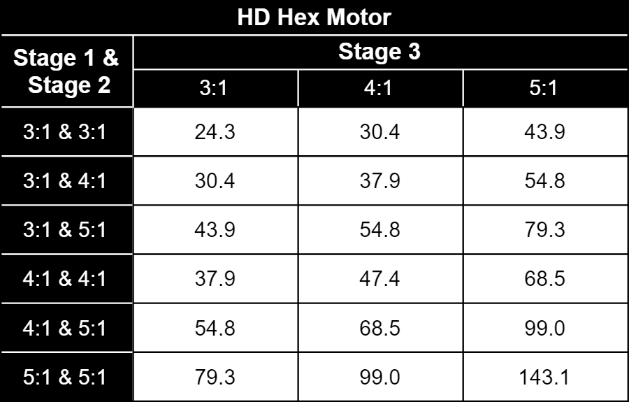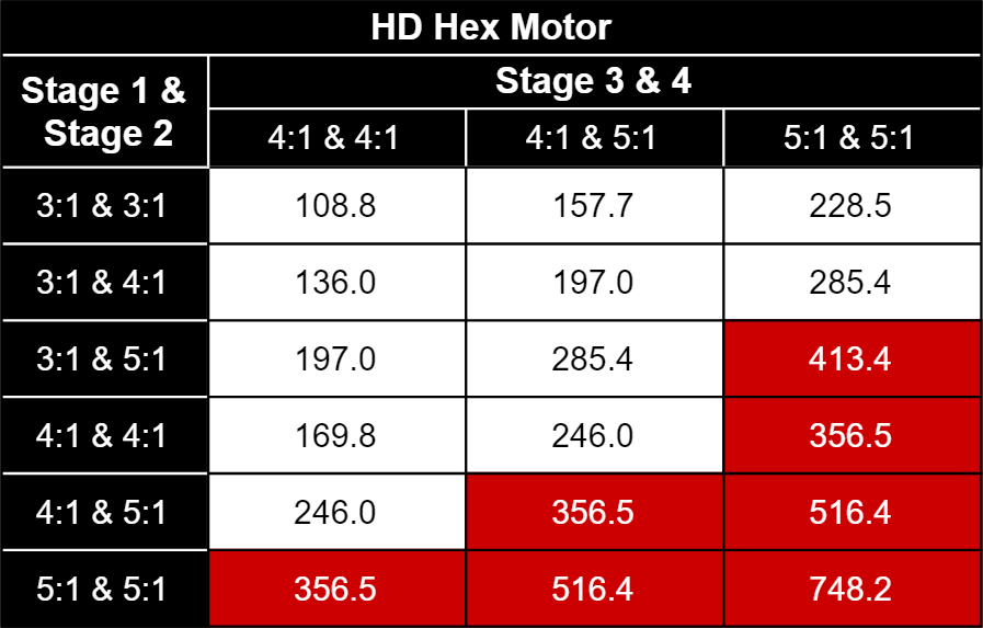 Ratings are based on testing conducted by REV Robotics on the UltraPlanetary system. All load ratings are based on a safety factor of 1.2 to accommodate manufacturing tolerances. The torques listed are for the output of the stage.