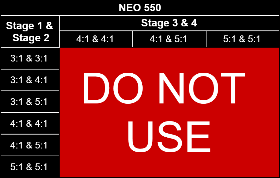Cartridge configuration tables for UltraPlanetary use a red rating system. If the motor and gear ratio combination is highlighted in red, the torque created by the motor can damage the gearbox. Non-highlighted combinations are within acceptable torque ranges.