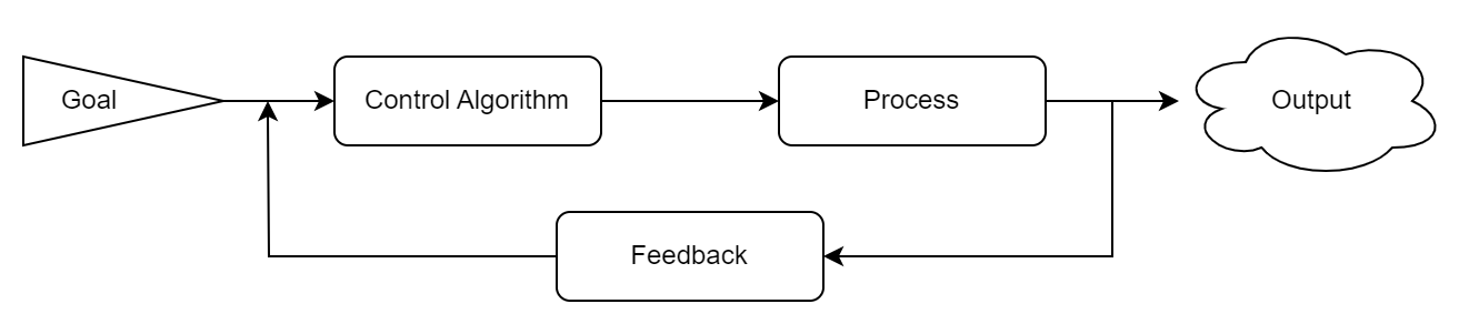 A simple example using this type of Control is an automatic coffee maker. In its Closed-Loop Control System, the output is hot coffee and the process we are getting feedback on is the heating of the water. If the coffee maker receives feedback that the water is cold, it will start to heat the pot. When the water is almost hot enough to brew the coffee, the control algorithm will continue to heat the water until the correct goal temperature has been reached. Once the water reaches it's goal temperature, or if it gets too hot, the system will stop heating the water and wait until it receives feedback that the heater needs to begin again.