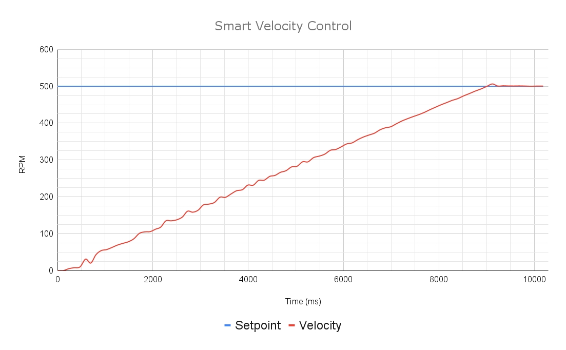 The Smart Velocity control mode utilizes the Smart Motion parameters to improve upon velocity control. Honoring the maximum acceleration, Smart Velocity will speed up and slow down your flywheel or rotary mechanism in a controlled way, reducing power draw and increasing consistency.