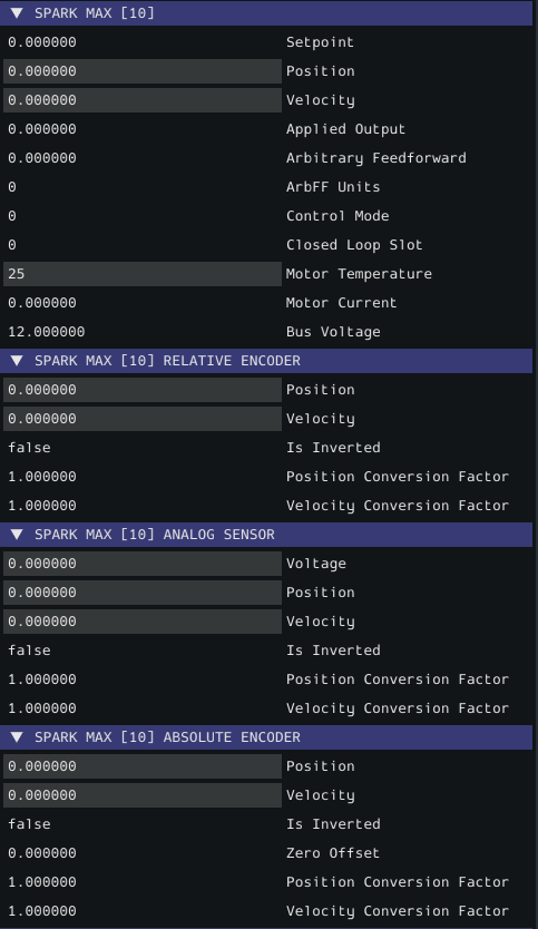 Each Spark device has a set of additional sensors, limit switches, and encoders that can be accessed and addressed in your robot code. To simulate each of these, we use a similar model where the user can directly set, either via the GUI or programmatically, each value that these devices measure.